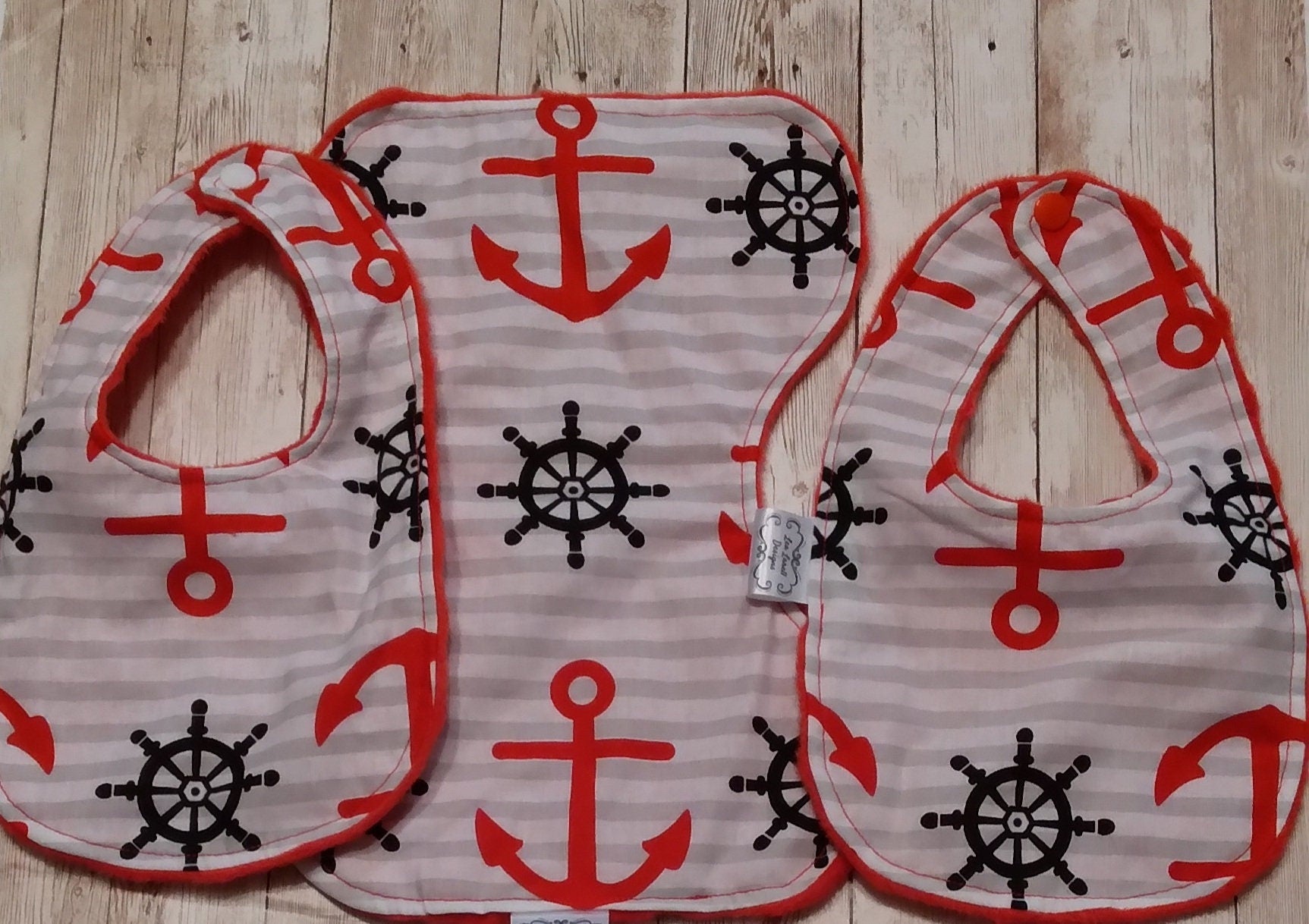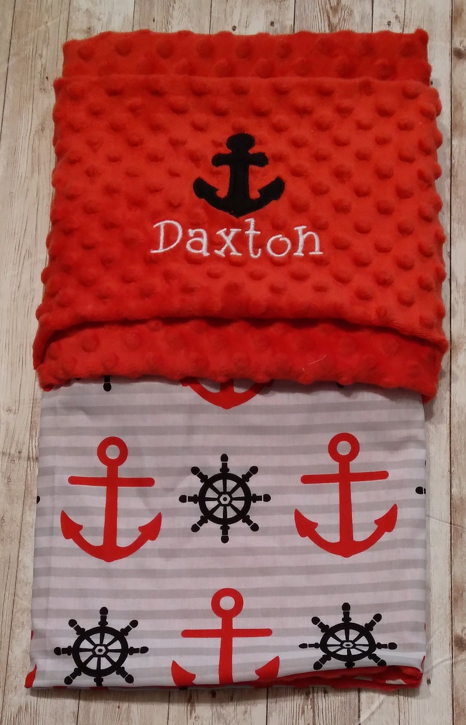 Beautifully and carefully sewn with love newborn blanket set for a newborn. You can customize and choose what you would like embroidered on the blanket. Great gift for baby shower to surprise the new mom with a handmade gift. Set comes with newborn receiving Blanket size approximately 30x30, a matching bib and burp cloth. Baby's name can be added for that personalized touch for no extra costs. Nautical fabric is super soft cotton and the other side is red minky dot fabric. Bib comes assembled with matching Kam snaps.